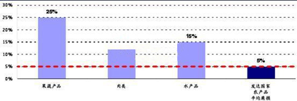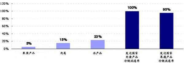 損耗率高的原因在于冷鏈物流體系全面落后。冷鏈流通率低使得冷鮮產品腐損率難以得到控制:目前中國果蔬、肉類、水產品冷鏈流通率分別為5%、15% 和23%,遠低于歐美發(fā)達國家水平,歐美等發(fā)達國家的肉禽冷鏈流通率已達100%,果蔬冷鏈流通率也達95%以上,而中國仍有大部分生鮮農產品仍在常溫下流通;部分產品雖然在屠宰或儲藏環(huán)節(jié)采用了低溫處理,但在運輸、銷售等環(huán)節(jié)又出現“斷鏈”現象,全程冷鏈的比率過低。