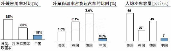 而國外的冷藏運輸則興起于19世紀上半葉歐美國家的鐵路,距今已有150多年的歷史。發(fā)展時間上的差距也就決定了中國的冷鏈物流僅僅處于剛剛起步的階段,不論從冷藏率還是從管理水平來看都要遠遠落后于發(fā)達國家。