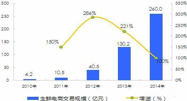 生鮮電商的發(fā)展呈現出爆發(fā)式增長態(tài)勢,資本造勢從未停歇。數據顯示,2010年,生鮮電商市場交易規(guī)模僅為4.2億元,到2012年增至40.5億元,同比增長286%;2013年達到130.2億元,同比增長221%;2014年,市場交易規(guī)模飆漲至260.0億元。