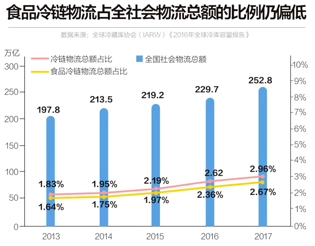 盡管冷庫(kù)和冷藏車的市場(chǎng)都在擴(kuò)張,我國(guó)的冷鏈,并算不上發(fā)達(dá)。中國(guó)物流行業(yè)的方便高效享譽(yù)全球,但其中食品冷鏈的份額只占不足3%,處于很低的水平。