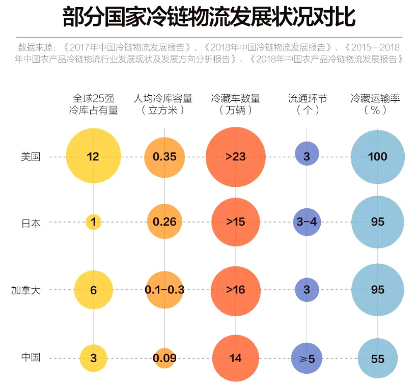 和部分國(guó)家比起來(lái),我國(guó)人均冷庫(kù)容量低、冷藏車數(shù)量少、流通周轉(zhuǎn)環(huán)節(jié)繁瑣且食品折損率高。只有全球25強(qiáng)冷庫(kù)這一指標(biāo)優(yōu)于日本,但這也是建立在我國(guó)比日本幅員遼闊的前提上。